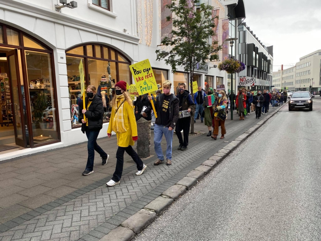 Ungliðahreyfing Íslandsdeildar Amnesty International leiddi kröfugönguna niður Laugaveg með kröfuskiltum, afgönskum fánum ásamt hinum gula einkennislit Amnesty International til merkis um að kröfur samstöðufundarins væri þáttur í alþjóðlegri baráttu fyrir mannréttindum afgansks flóttafólks.
